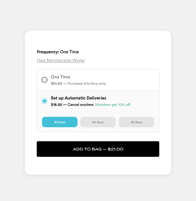 We rebuilt the Recharge flow: clear savings messaging, a clean one-time vs. subscribe toggle, and sensible intervals. Mobile-first and measurable end-to-end.